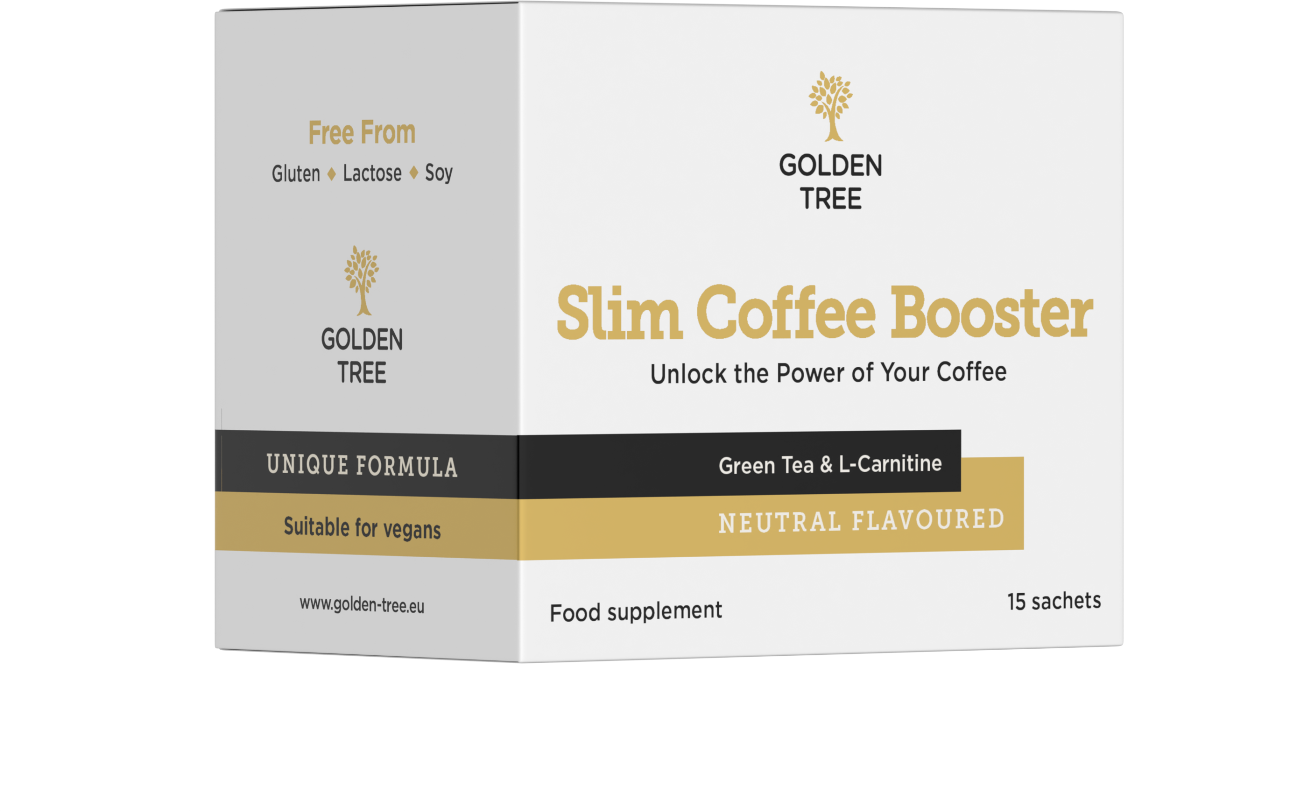 Slim Coffee Booster is een voedingssupplement van het merk Golden Tree, aangeboden in de vorm van oplosbaar poeder in sachets. Eén doos bevat vijftien sachets, wat overeenkomt met een kuur van vijftien dagen. Het product is specifiek ontworpen om te worden opgelost in koffie, zonder de smaak of het aroma ervan te beïnvloeden. Op basis van de beschikbare gegevens positioneert het zich als een thermogene ondersteuning bij gewichtsbeheersing, gebaseerd op een combinatie van plantenextracten, een aminozuur en een spoorelement. De formule is vegan, glutenvrij en lactosevrij, waardoor zij beantwoordt aan de verwachtingen van een breed volwassen publiek dat een discrete dagelijkse ondersteuning zoekt.